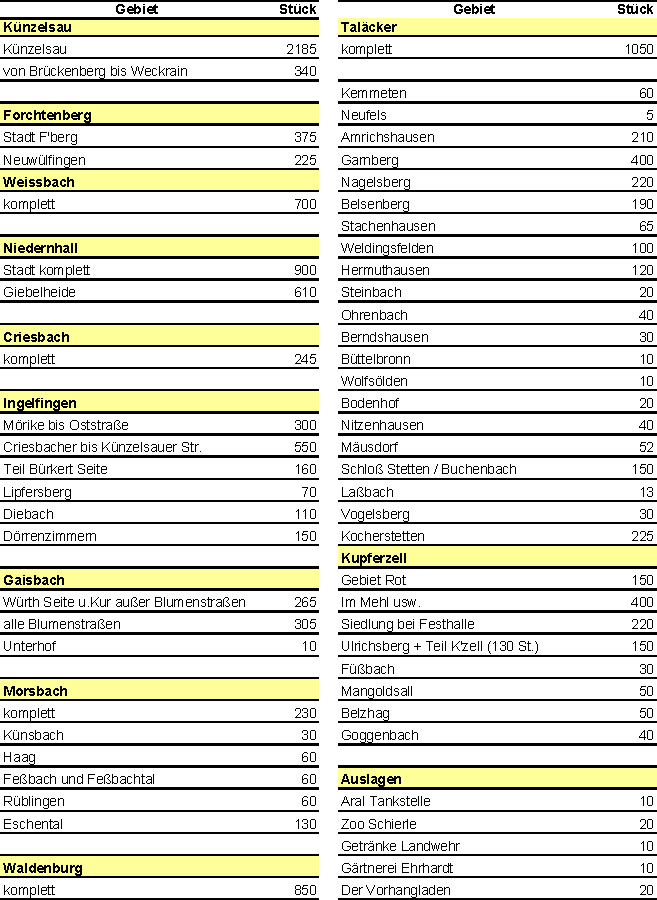 Unser Verteilungsgebiet erstreckt sich von Eschental bis Forchtenberg und Waldenburg bis Stachenhausen
